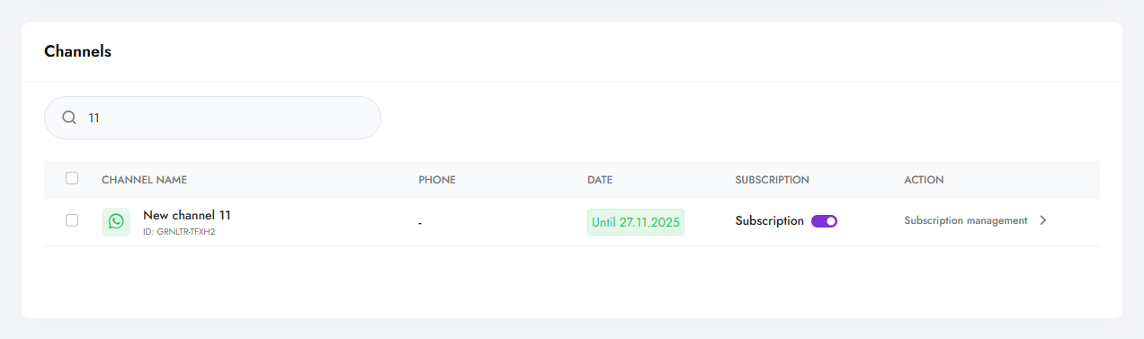 In this section, you can see all your channels, the expiration date of the paid period, and the actions available for each of them.\