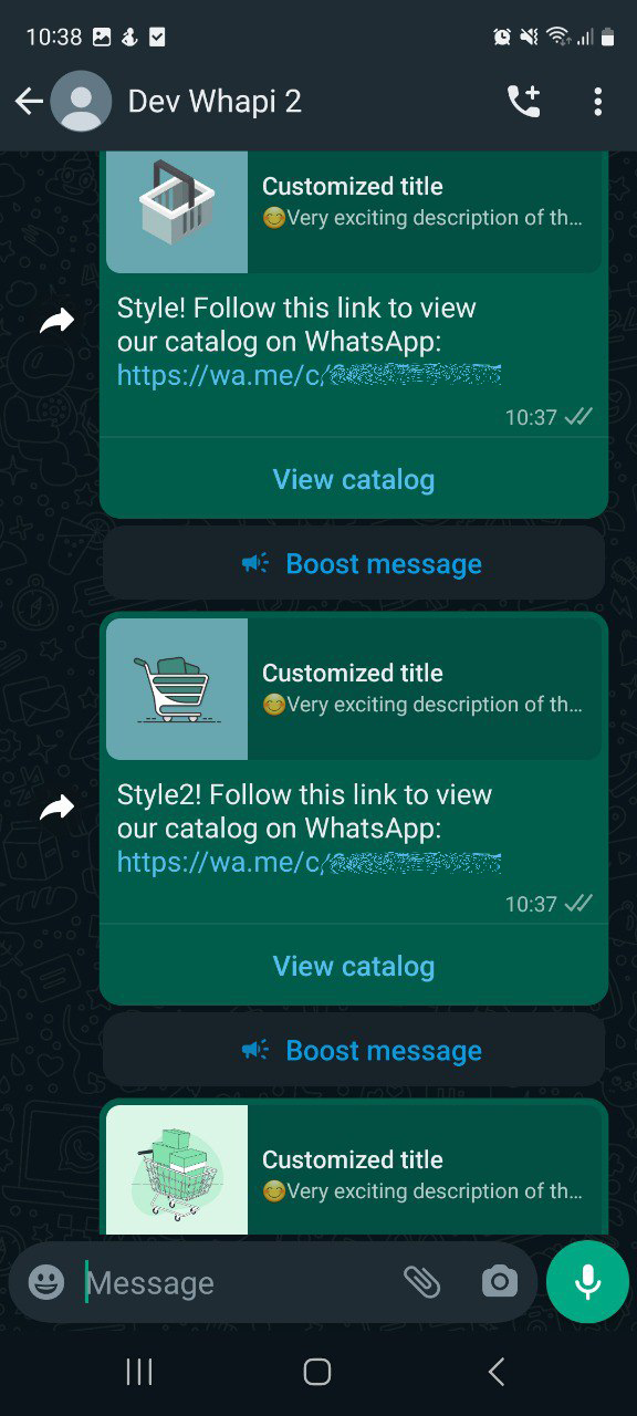 <figure><img src="https://2417185145-files.gitbook.io/~/files/v0/b/gitbook-x-prod.appspot.com/o/spaces%2FhsdgGmVCG31mEaHyRvxC%2Fuploads%2FHKQ0zkhONqV3GXfZugyv%2Fsend-catalog-whapi.png?alt=media&#x26;token=a35ee6ec-ce32-4951-872c-3e764164923b" alt="" width="144"><figcaption><p>Great opportunities to customize the message</p></figcaption></figure>