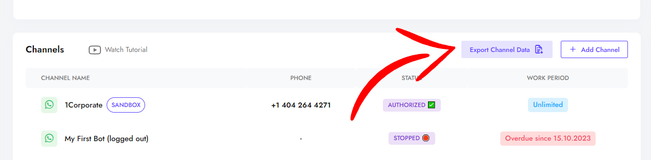 We gave our partners the opportunity to export information about all channels in the project in CSV format. The exported file has information about channels at the moment of downloading: Name, ID, Phone Number, Work Period, Status, Mode